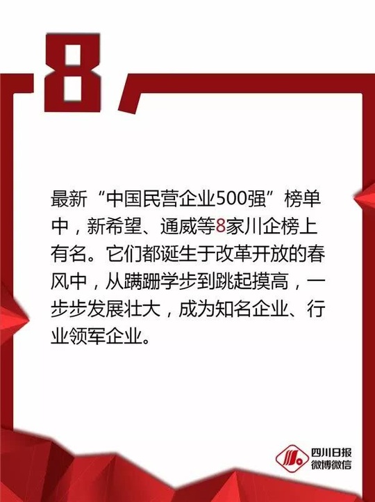 民营企业的规模从几亿到两万亿,从蹒跚起步到撑起四川经济的“半边天”,为你们骄傲!恭喜上榜的企业和企业家们,也感谢还没有上榜的企业和企业家们,为你们加油!